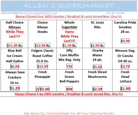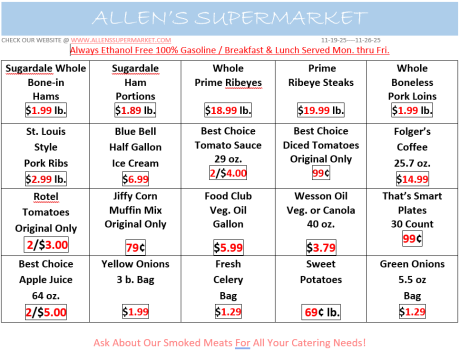Allen's Supermarket regularly has special offers for you. You can expect high quality food at even more affordable prices along with our friendly and helpful personnel. Come on over and have a